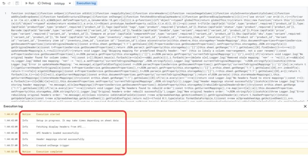 You will see this execution log at the bottom of the screen. That means your Apps Script has been deployed successfully.