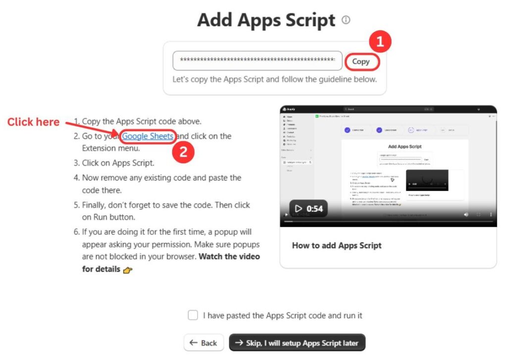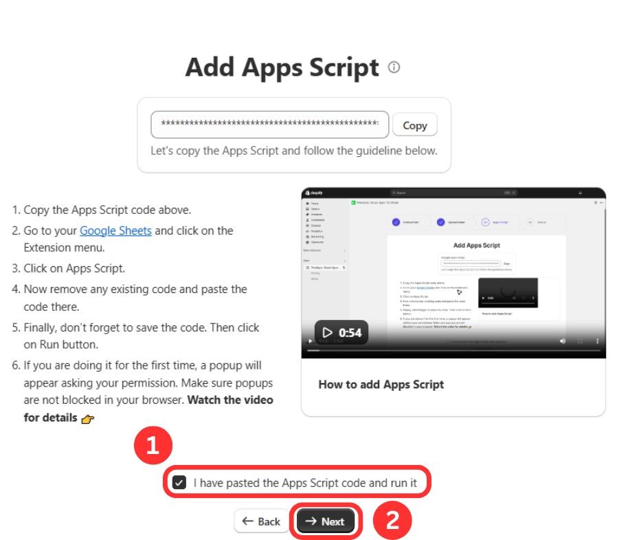 Check the box to confirm the Apps Script is set up, then click Next.