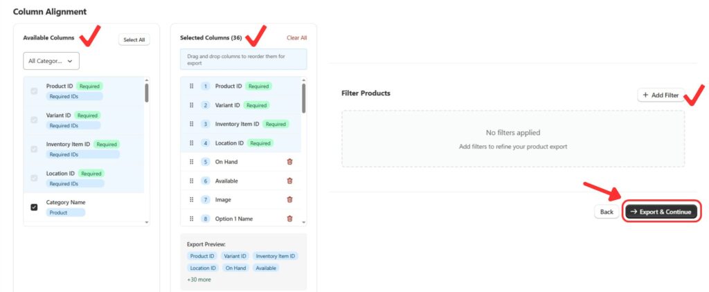 Select which columns you want to include in your Google Sheet, rearrange their order, or apply filters to control what data is exported.
