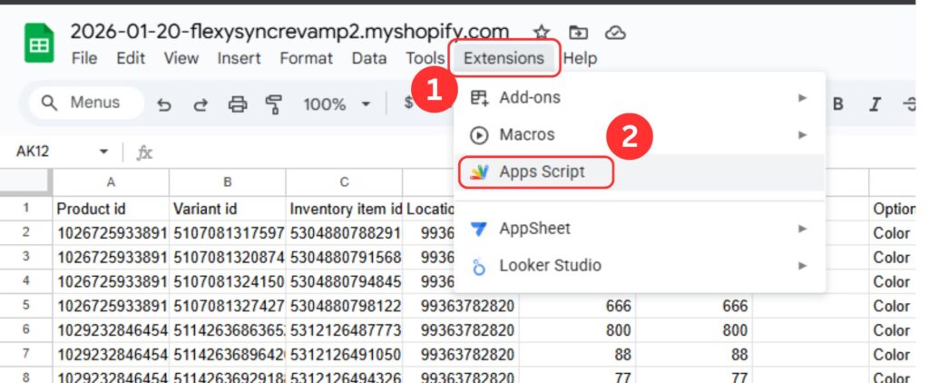Then navigate to the Google Sheet that you just opened. Click on Extensions > Apps Script.