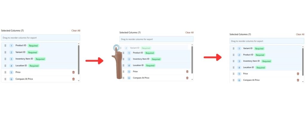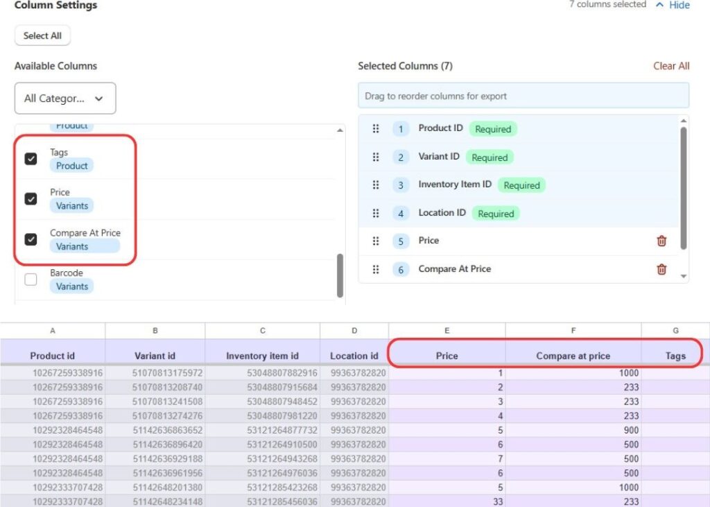 - Required columns (like Product ID, Variant ID, Inventory Item ID, Location ID) are always included and cannot be edited.