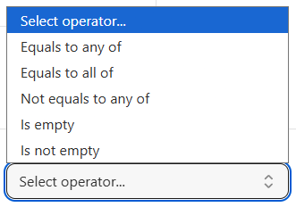 Matches an exact single value (commonly used for Status or Vendor). - Is empty