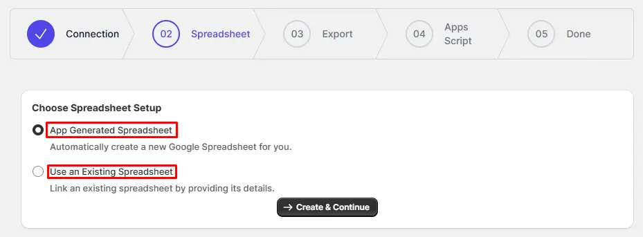 FlexSync offers two options for spreadsheet setup. You can create a new Google Sheet manually and connect it to FlexSync, or let the app create a spreadsheet automatically on your behalf. Choose the option that fits your workflow and proceed to the next step.